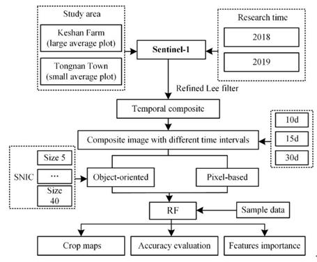 研究人員對研究區作物生長季(5月-9月)的Sentinel-1影像按三種時間間隔(10d、15d和30d)進行合成;然后使用簡單非迭代聚類算法(SNIC)對合成影像按照不同空間尺度進行分割,最后將訓練樣點和經過不同處理的影像輸入隨機森林分類器進行作物分類(圖1)。