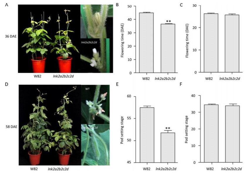 李趙博博士利用全基因組關聯分析(Genome-wide association studies, GWAS)技術與擬南芥重要生物鐘基因進行同源比對的方法,在大豆中鑒定到一調控開花期新基因LNK2 (Night light-inducible and clock-regulated 2)。利用CRISPR/Cas9開發出LNK2基因的轉基因四重純合突變體,在長日照條件下,四重突變體的開花時間明顯早于野生型(圖2)。熒光定量PCR顯示,在長日照條件下,LNK2的轉錄水平明顯低于野生型。LNK2促進了豆類特異性E1基因的表達,并抑制了開花素FT2a的表達。這些結果表明,CRISPR/CAs9介導的4個LNK2基因的靶向突變縮短了大豆的開花時間。