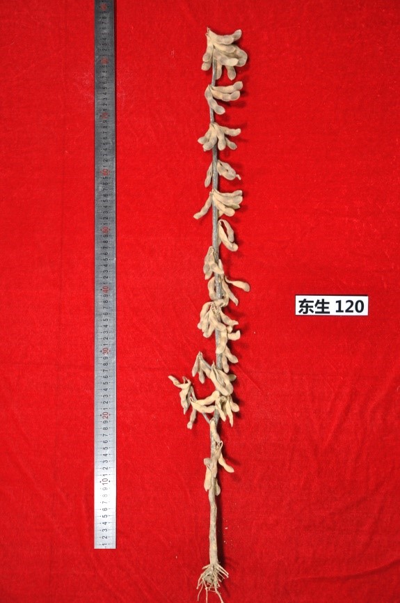 “東生120” (審定編號:吉審豆20210032)為高產、高油大豆新品種。該品種以吉大豆2號為父本,黑農48號為母本。2019-2020年區域試驗平均公頃產量2975.8公斤,比對照品種吉育86增產7.1%;2020年生產試驗平均公頃產量2947.3公斤,比對照吉育86增產3.8%。2019-2020年區域試驗平均公頃產量2975.8公斤,比對照品種吉育86增產7.1%;2020年生產試驗平均公頃產量2947.3公斤,比對照吉育86增產3.8%。亞有限結莢習性,平均株高88.9厘米,主莖型結莢,主莖節數16.4個,以三粒莢為主,莢熟時呈深褐色。圓葉、白花、灰毛,籽粒圓形,種皮黃色,有光澤,種臍黃色,平均百粒重18.5克。人工接種鑒定,高抗大豆花葉病毒1號株系,高抗大豆花葉病毒3號株系。兩年平均籽粒粗蛋白質含量37.78%,粗脂肪含量22.10%。