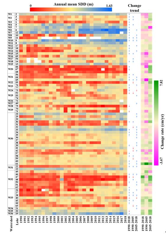 圖1 不同時(shí)段77個(gè)湖庫的年均透明度變化以及年變化率。