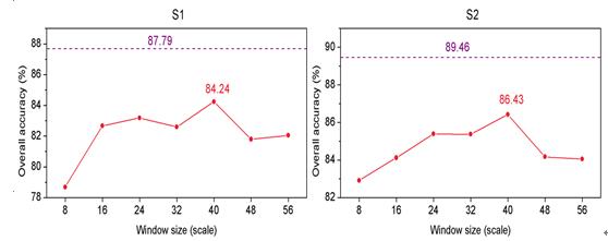 圖2. CNN卷積窗口尺寸對于OCNN(紅色線段)和SS-OCNN(紫色虛線段)的影響