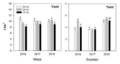 圖1. 2016、2017和2018年耕層厚度對玉米和大豆成熟期產量的影響