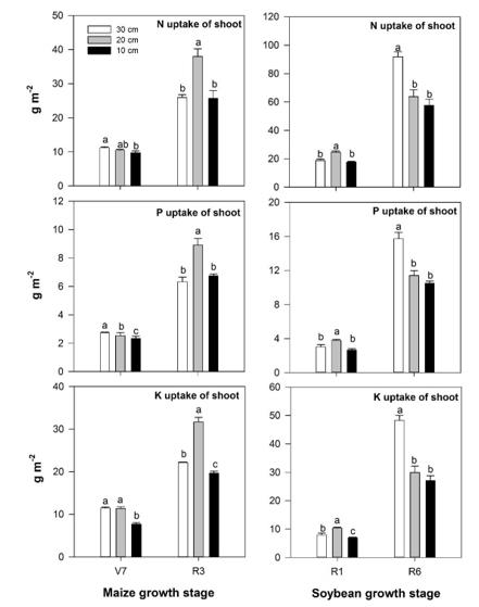 圖2. 2017年耕層厚度對玉米拔節(jié)期(V7)和乳熟期(R3)及大豆始花期(R1)和鼓粒期(R6)植物營養(yǎng)吸收的影響