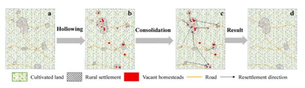 針對鄉村居民點“破碎化”和日益突出的村莊“空心化”問題,研究組提出一種在村域尺度上對居民點優化重組的“整小填大”新模式。主要做法是引導長期在城鎮居住的農戶有償退出閑置宅基地,將小面積居民點內的農戶通過宅基地置換的方式搬遷到大面積居民點的閑置宅基地內,并將小居民點內宅基地全部騰退出來后進行整理和復墾。