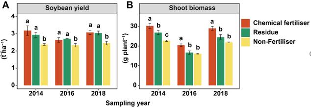 玉米-大豆輪作是東北黑土區(qū)主要的種植模式。然而,由于植物-土壤-微生物之間的相互作用,玉米秸稈還田如何改變大豆氮吸收模式仍不清楚;量化下一季大豆對(duì)玉米秸稈氮的利用,對(duì)于優(yōu)化氮肥的施用策略,促進(jìn)黑土區(qū)農(nóng)業(yè)的可持續(xù)發(fā)展至關(guān)重要。為此,中國科學(xué)院東北地理所的研究人員于2013年在黑龍江省海倫市設(shè)立田間定位試驗(yàn),基于玉米-大豆輪作體系,在玉米生長(zhǎng)季正常施用化肥,研究了大豆生長(zhǎng)季(1)不施肥(2)施用化肥和(3)玉米秸稈還田對(duì)大豆氮吸收及產(chǎn)量形成的影響。結(jié)果表明:在玉米-大豆輪作條件下,秸稈還田處理與施用化肥處理之間的大豆產(chǎn)量沒有顯著差異(P > 0.05)(圖1),秸稈還田處理大豆的收獲指數(shù)明顯提高,這很可能是因?yàn)橛衩捉斩掃€田改變了下茬大豆對(duì)氮的積累模式。為此,利用穩(wěn)定同位素15N標(biāo)記的方法,深入研究了大豆對(duì)肥料氮、土壤氮、秸稈氮和共生固氮的利用,探討了秸稈還田對(duì)大豆植株體內(nèi)不同來源氮素的積累影響以及與大豆產(chǎn)量形成之間的關(guān)系。研究結(jié)果揭示了秸稈還田可增加大豆生長(zhǎng)后期的氮吸收量,但R5-R8期營養(yǎng)器官氮素的再利用量卻顯著下降(圖2),發(fā)現(xiàn)秸稈還田對(duì)大豆氮素積累影響主要來自對(duì)共生固氮的促進(jìn)作用,表現(xiàn)為根瘤數(shù)量、質(zhì)量和密度顯著提高。進(jìn)一步的機(jī)制研究發(fā)現(xiàn),秸稈還田顯著提高了大豆根際固氮nifH基因拷貝數(shù)且改變固氮微生物群落結(jié)構(gòu)(圖3),固氮菌對(duì)結(jié)瘤位的競(jìng)爭(zhēng)能力增強(qiáng)。基于此研究結(jié)果,我們認(rèn)為黑土玉米-大豆輪作體系可以通過秸稈還田的方式來達(dá)到減少氮肥施用,提高大豆固氮生態(tài)效應(yīng),進(jìn)而實(shí)現(xiàn)大豆穩(wěn)產(chǎn)、高產(chǎn)。