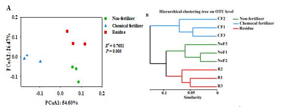 圖3 秸稈還田、不施肥和施用化肥固氮菌群落結(jié)構(gòu)PCoA分析(A)和聚類分析(B)