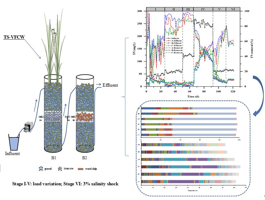 低碳氮比廢水的不適當(dāng)處理在世界范圍內(nèi)引起廣泛關(guān)注。人工濕地作為可持續(xù)的生態(tài)凈化技術(shù)已被成功應(yīng)用于不同類型污水的處理。科研人員前期對人工濕地基質(zhì)強(qiáng)化脫氮方面做出了重要貢獻(xiàn),但在鐵礦石/錳礦石與木頭芯片組合模式強(qiáng)化硝化和反硝化脫氮方面仍缺乏系統(tǒng)性的研究。鹽分沖擊也是人工濕地處理系統(tǒng)脫氮的最大挑戰(zhàn),可能會瞬間提高細(xì)胞滲透壓和抑制微生物活性。針對這一技術(shù)難題,東北地理所水環(huán)境污染與防治學(xué)科組科研人員,設(shè)計(jì)并構(gòu)建了鐵礦石/錳礦石與木頭芯片基串聯(lián)-垂直流人工濕地(TS-VFCWs)(CN201911301822.2、CN201911301820.3),系統(tǒng)揭示了污染負(fù)荷和鹽分脅迫下TS-VFCWs脫氮性能和功能菌群特征(Chietal.2021)。
