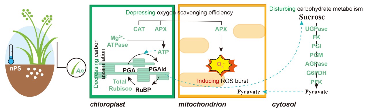 利用熒光顯微鏡觀察發(fā)現(xiàn),經(jīng)熒光標(biāo)記納米塑料處理的大麥植株葉片的原生質(zhì)體中具有熒光,表明納米塑料進(jìn)入植物細(xì)胞。在低溫脅迫下,納米塑料顆粒處理的大麥植株葉片具有更小的凈光合速率。進(jìn)一步提取葉綠體后發(fā)現(xiàn),納米塑料顆粒處理降低了Mg2+-ATPase和核酮糖-1.5-二磷酸羧化酶/加氧酶(Rubisco)活性,引起ATP 含量下降。以上結(jié)果表明,納米塑料顆粒處理干擾了低溫脅迫下大麥的光合碳同化,加劇了能量物質(zhì)失衡。接下來,研究人員對植物糖酵解過程進(jìn)行了研究,發(fā)現(xiàn)納米塑料顆粒處理降低了低溫脅迫下大麥葉片中UDP-葡萄糖焦磷酸化酶(UGPase)、ADP-葡萄糖焦磷酸化酶(AGPase) 、磷酸葡萄糖變位酶(PGM)、磷酸葡萄糖異構(gòu)酶(PGI)、6-磷酸葡萄糖脫氫酶(G6PDH)、果糖激酶(FK)、磷酸果糖激酶(PFK)活性,進(jìn)一步擾亂植物碳水化合物代謝。該試驗(yàn)還通過提取葉綠體和線粒體,在亞細(xì)胞水平上對低溫和納米塑料顆粒引起的氧化脅迫進(jìn)行了研究。研究表明,納米顆粒引起了低溫脅迫下植物葉片線粒體中活性氧(ROS)的累積,并且使葉綠體中過氧化氫酶(CAT)、抗壞血酸過氧化物酶(APX)以及線粒體中APX活性降低,降低ROS清除效率。