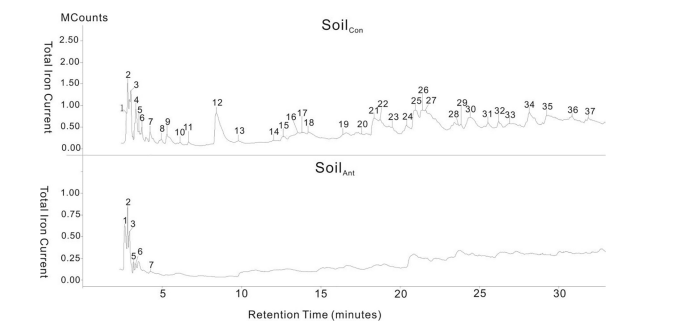圖1 蟻丘與對照土壤SOM熱裂解-GC/MS圖譜