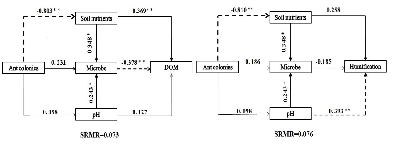 圖3 揭示蟻群對DOM含量和腐殖化程度影響的結(jié)構(gòu)方程模型
