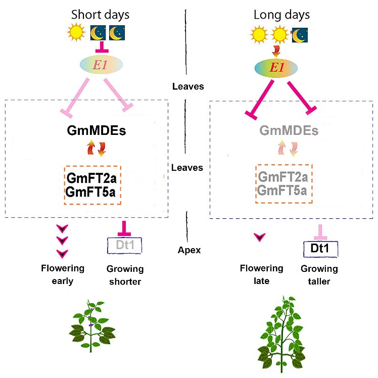 大豆是典型的光周期敏感短日照作物,大豆生育期(開(kāi)花期與成熟期)及株型都嚴(yán)格受光周期調(diào)控。短日照條件下,大豆的生育期短,植株矮小,長(zhǎng)日條件下大豆的生育期延長(zhǎng),植株莖節(jié)增多,植株高大。大豆光周期敏感性使單個(gè)大豆品種適宜種植范圍狹窄,造成了許多優(yōu)良品種的推廣范圍小,有“寶”難用,影響了我國(guó)大豆的穩(wěn)產(chǎn)與高產(chǎn)。中國(guó)科學(xué)院東北地理與農(nóng)業(yè)生態(tài)研究所大豆分子設(shè)計(jì)育種課題組于2012年首次在大豆中成功克隆了對(duì)光周期反應(yīng)及生育期(開(kāi)花期及成熟期)貢獻(xiàn)最大的基因E1(PNAS, Xia et al., 2012)。E1編碼豆科植物特異性轉(zhuǎn)錄因子,是大豆光周期響應(yīng)的核心調(diào)控因子,闡明其介導(dǎo)開(kāi)花途徑的分子機(jī)制尤為重要。然而,目前有關(guān)E1所調(diào)控的下游信號(hào)通路在很大程度上仍是未知的。