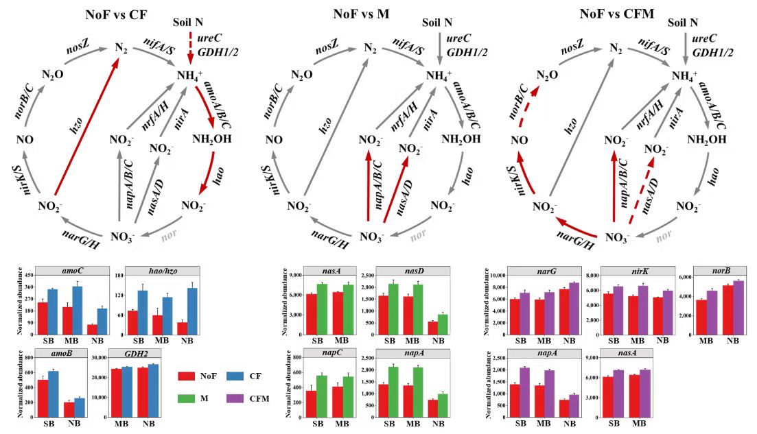 在此基礎(chǔ)上,團(tuán)隊(duì)進(jìn)一步利用高通量宏基因組測(cè)序技術(shù),針對(duì)黑土農(nóng)田碳氮循環(huán)功能基因進(jìn)行分析。結(jié)果顯示,單施有機(jī)肥或與化肥配施顯著改變黑土碳氮功能基因的群落結(jié)構(gòu),增加了纖維素和果膠降解的涉碳基因豐度;而長(zhǎng)期單施化肥顯著積累了黑土氨氧化作用相關(guān)功能基因豐度,可能導(dǎo)致硝酸鹽富集淋失及N2O排放增加(圖1);同時(shí)發(fā)現(xiàn)長(zhǎng)期有機(jī)肥添加顯著富集同化和異化硝酸鹽還原作用相關(guān)功能基因,這有助于提升黑土銨態(tài)氮含量及氮肥利用率(圖2);然而,有機(jī)肥化肥配施會(huì)進(jìn)一步導(dǎo)致黑土反硝化作用相關(guān)功能基因豐度的顯著增加,表明過(guò)量氮素養(yǎng)分投入可造成土壤氮素通過(guò)氣態(tài)形式損失的風(fēng)險(xiǎn)(圖2)。該研究為推進(jìn)黑土區(qū)化肥減量化,構(gòu)建有機(jī)肥施用長(zhǎng)效機(jī)制提供微生物學(xué)理論依據(jù)。