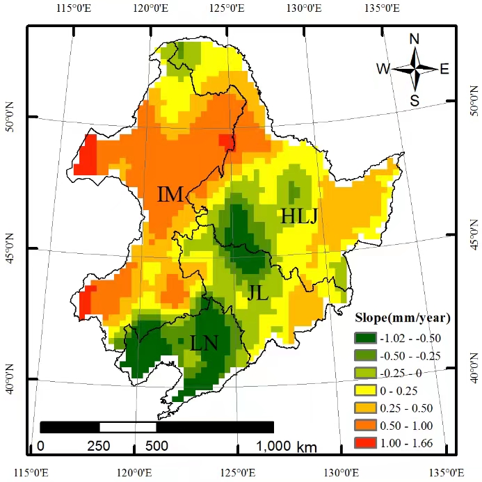 圖1東北地區玉米根區0-200 cm深度范圍土壤水分時間變化率的空間分布特征