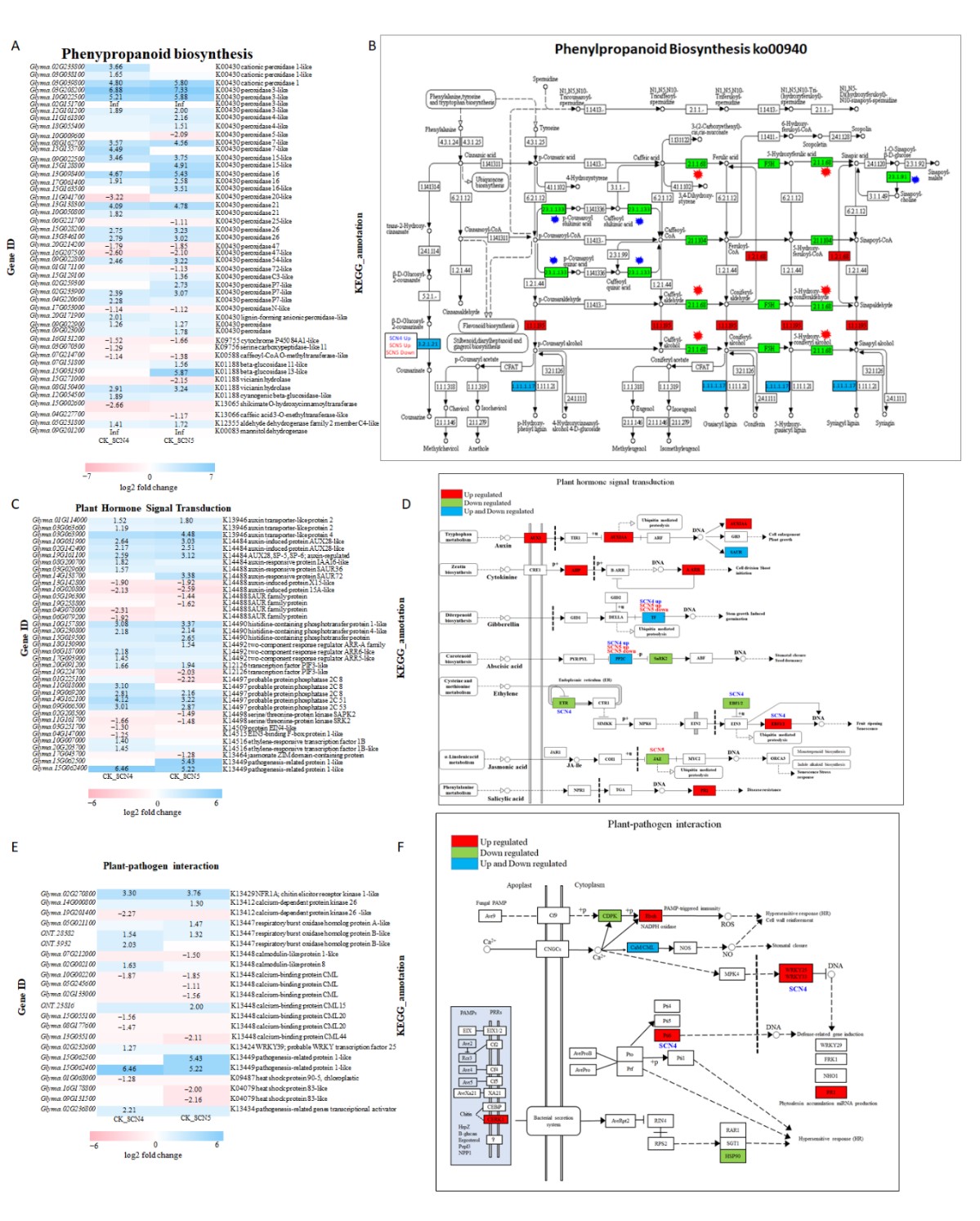 三代全長(zhǎng)轉(zhuǎn)錄組測(cè)序技術(shù)相比二代測(cè)序技術(shù),無(wú)需打斷,可直接讀取全長(zhǎng)RNA分子全長(zhǎng)序列,準(zhǔn)確辨別二代測(cè)序技術(shù)無(wú)法準(zhǔn)確識(shí)別的如可變剪接(AS)、可變多聚腺苷酸化(APA)、融合基因、長(zhǎng)鏈非編碼RNA(lncRNA)等結(jié)構(gòu),且可同時(shí)對(duì)基因和轉(zhuǎn)錄本進(jìn)行定量分析等優(yōu)點(diǎn)。通過(guò)對(duì)接種8天的大豆種質(zhì)09-138進(jìn)行全長(zhǎng)轉(zhuǎn)錄組測(cè)序及分析,共獲得6.1 GB的clean data和65,038個(gè)轉(zhuǎn)錄本序列;轉(zhuǎn)錄本去冗余后鑒定得到1117個(gè)新基因和41,096個(gè)新轉(zhuǎn)錄本;進(jìn)而對(duì)新轉(zhuǎn)錄本的序列結(jié)構(gòu)進(jìn)行分析,發(fā)現(xiàn)不親和抗性反應(yīng)比親和性反應(yīng)產(chǎn)生更多>10-PolyA位點(diǎn)(APA)和更多得融合基因,lncRNA和防御反應(yīng)有關(guān)的轉(zhuǎn)錄因子相關(guān)聯(lián),AS的3’和5’剪接位點(diǎn)數(shù)量接種后都發(fā)生變化,說(shuō)明這些結(jié)構(gòu)變異參與了線蟲(chóng)的抗感反應(yīng)。差異表達(dá)基因(DEGs)的GO(Gene Oncology)和代謝通路KEGG(Kyoto Encyclopedia of Genes and Genomes)分析結(jié)果顯示抗感線蟲(chóng)侵染后富集于生長(zhǎng)激素、生長(zhǎng)素激活信號(hào)通路和多維細(xì)胞生長(zhǎng)通路以及苯丙烷生物合成通路(圖1);在非親和反應(yīng)中發(fā)現(xiàn)更多的與應(yīng)激反應(yīng)元件(圖2)、植物激素信號(hào)轉(zhuǎn)導(dǎo)途徑和植物-病原菌互作途徑相關(guān)的DEGs上調(diào)表達(dá)(圖1),而在親和性反應(yīng)中檢測(cè)到更多與細(xì)胞壁修飾和碳水化合物生物過(guò)程相關(guān)的上調(diào)基因表達(dá);結(jié)合DEGs的蛋白質(zhì)-蛋白質(zhì)互作分析首次發(fā)現(xiàn)線蟲(chóng)侵染大豆根部后只有不親和反應(yīng)激起激酶MAPK/KK/KKK、轉(zhuǎn)錄因子WRKY和鈣調(diào)蛋白VQ之間互作參與抗性防御調(diào)控(模型如圖3)。本研究中獲得的AS、APA和lncRNA為植物-線蟲(chóng)相互作用過(guò)程中轉(zhuǎn)錄后修飾的功能研究提供理論基礎(chǔ),且大豆與大豆孢囊線蟲(chóng)間親和性和非親和性互作的分子機(jī)制將有助于解析其他植物與線蟲(chóng)互作的分子機(jī)理,進(jìn)一步的功能研究將有助于探索線蟲(chóng)防治的新策略。