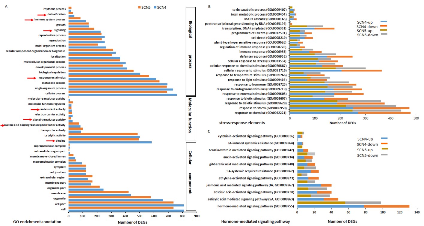 大豆孢囊線蟲(chóng)病(SCN,Heterodera glycines)是制約大豆生產(chǎn)的全球毀滅性病害之一。大豆抗病品種應(yīng)用是防治大豆孢囊線蟲(chóng)病最經(jīng)濟(jì)有效的方法,然而大豆對(duì)大豆孢囊線蟲(chóng)的抗性是由多基因控制并具有數(shù)量性狀的特性,但抗性背景單一,線蟲(chóng)生理小種易發(fā)生變異,因此亟需開(kāi)發(fā)多抗基因資源和培育多抗品種。農(nóng)田有害生物控制學(xué)科組王從麗研究員團(tuán)隊(duì)在前期研究過(guò)程中篩選到一個(gè)新的大豆抗線蟲(chóng)育種基因型09-138(rhg1a + Rhg4b),對(duì)毒性強(qiáng)的生理小種(SCN4)具有抗性,但對(duì)毒性弱的生理小種(SCN5)感病(Huang等,2022,Nematology),為了充分利用該抗性資源,了解其抗性機(jī)制,該團(tuán)隊(duì)首次在大豆上利用三代全長(zhǎng)轉(zhuǎn)錄組測(cè)序技術(shù)(Oxford Nanopore Technology, ONT)開(kāi)展了該大豆種質(zhì)對(duì)孢囊線蟲(chóng)親和性(感病)和非親和性(抗病)反應(yīng)的調(diào)控機(jī)理研究。