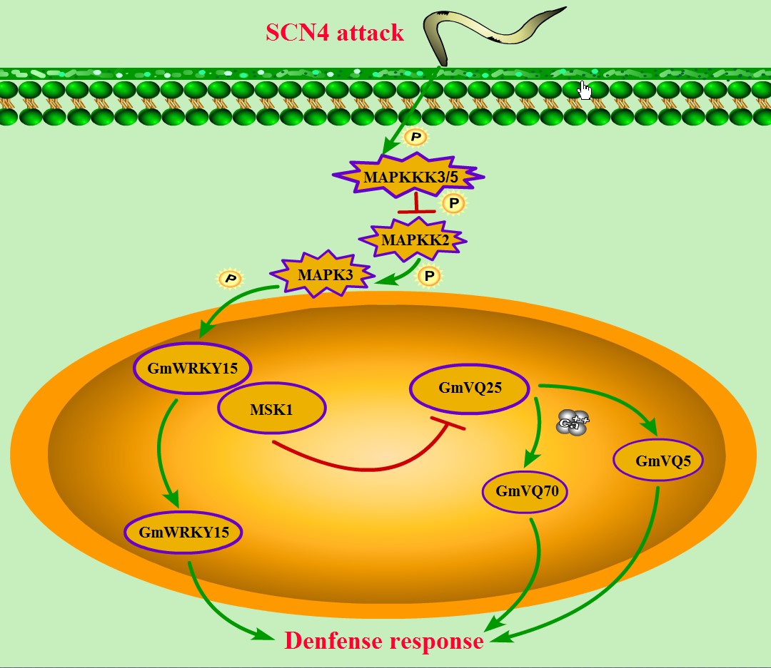 圖3 大豆孢囊線蟲(chóng)侵染大豆不親和反應(yīng)激起MAPK-WRKY-VQ互作防御反應(yīng)