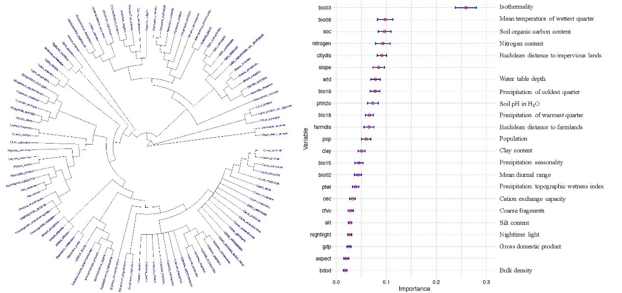 圖1. 中國內(nèi)陸沼澤濕地優(yōu)勢種發(fā)育關系及各環(huán)境因子重要性
