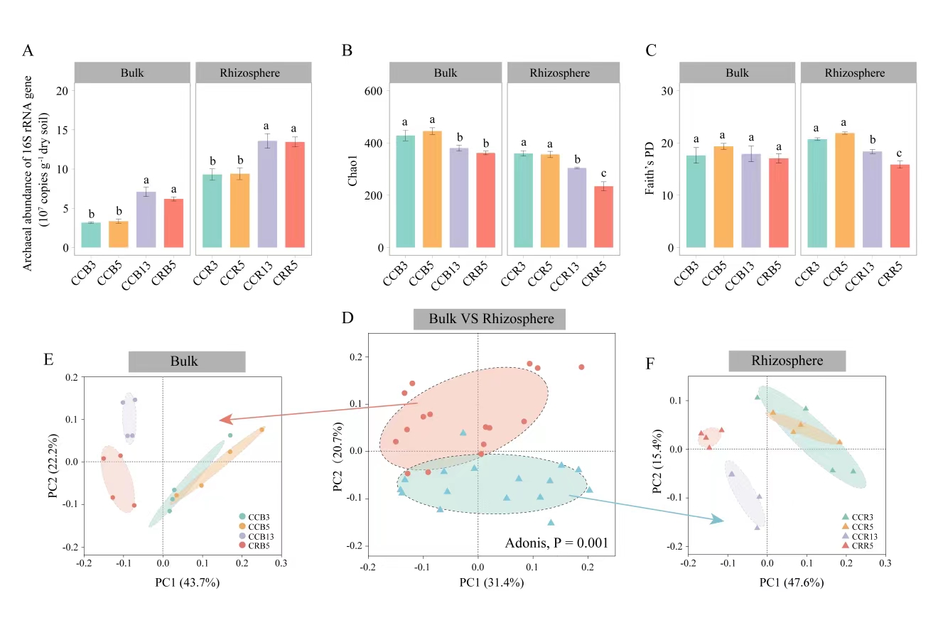 為此,東北地理所農田分子生態學科組科研人員基于大豆短期連作(3年和5年)、長期連作(13年)及大豆-玉米輪作處理,采用高通量測序技術系統研究了根際和非根際土壤古菌群落的豐度、多樣性和組成特征,結合細菌和真菌群落對微生物網絡結構和微生物抗性進行綜合分析,以闡明連作下土壤微生物群落變化與作物產量間的互作關系。