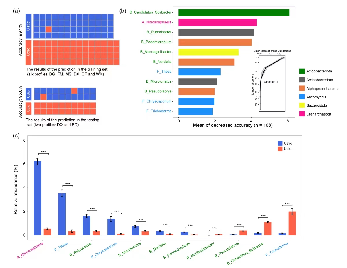 黑土是寶貴的土壤資源,不同國家對黑土分類賦予了不同的名稱。我國土壤分類體系(CST)將黑土命名為均腐土綱(Isohumosols)。東北均腐土綱按照水分狀況又被劃分為干潤(Ustic)和濕潤(Udic)兩個(gè)亞綱。為回答黑土剖面微生物結(jié)構(gòu)組成是否與其分類相關(guān)聯(lián),東北地理所農(nóng)田分子生態(tài)學(xué)科組科研人員按照土壤剖面診斷層特征,在黑龍江省采集了4個(gè)干潤和4個(gè)濕潤均腐土土系,共計(jì)148個(gè)土壤樣本(圖1)。采用高通量測序和定量PCR技術(shù),對這些樣本中的細(xì)菌、古菌和真菌多樣性、群落結(jié)構(gòu)組成和豐度進(jìn)行了系統(tǒng)的研究和分析。研究發(fā)現(xiàn)均腐土土壤微生物可以很好地劃分為干潤和濕潤兩大類型(圖2),同一土系微生物從Ah層到C層呈現(xiàn)出規(guī)律性的變化,但兩個(gè)均腐土亞綱間C層微生物群落結(jié)構(gòu)組成、多樣性的差異大于Ah層,表明母質(zhì)層土壤微生物群落結(jié)構(gòu)或許更能表征兩類亞綱土壤的形成。利用機(jī)器學(xué)習(xí)模型解析發(fā)現(xiàn),土壤微生物群落屬水平上的數(shù)據(jù)可以很好地預(yù)測兩類亞綱均腐土的分類,其準(zhǔn)確率大于95%(圖3);同時(shí)也發(fā)現(xiàn)這些數(shù)據(jù)也可以很好地預(yù)測均腐土不同診斷層分布,準(zhǔn)確率大于92%(圖4)。該研究創(chuàng)新性地將剖面土壤微生物指標(biāo)與土壤分類建立聯(lián)系,為后續(xù)相關(guān)研究提供了范本,也為從微生物學(xué)角度認(rèn)識(shí)土壤形成過程提供了理論依據(jù)。