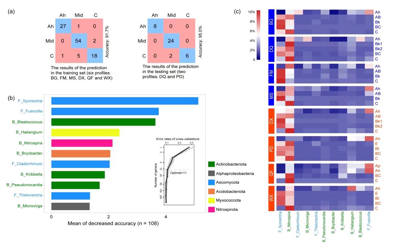 圖4 機(jī)器學(xué)習(xí)方法表明土壤微生物屬水平上的數(shù)據(jù)準(zhǔn)確地預(yù)測了不同土壤診斷層