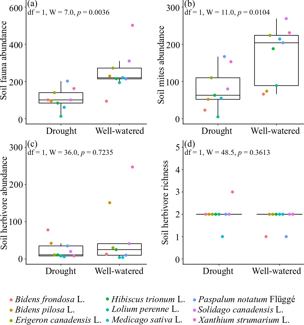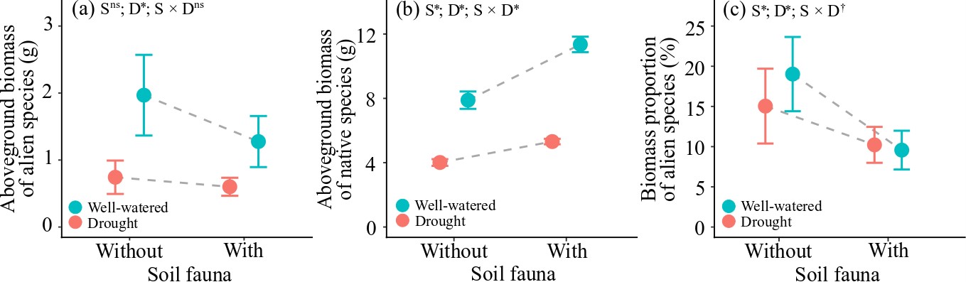 作為生態(tài)系統(tǒng)的重要限制性環(huán)境因子,土壤養(yǎng)分和水分變化可能會影響植物入侵過程。與養(yǎng)分富集促進(jìn)外來植物入侵的普遍共識不同,干旱對外來植物入侵影響的研究相對缺乏、且研究發(fā)現(xiàn)存在分歧。原因之一可能是部分控制實(shí)驗(yàn)只考慮了干旱對外來植物入侵直接效應(yīng),并未考慮外來/本地植物與其他生物類群的互作過程。已有研究證實(shí)中型土壤動物會影響植物之間的競爭、且對土壤水分變化的響應(yīng)敏感。因此,理論上中型土壤動物存在與否會影響干旱情景下的植物入侵過程。但是,目前對該問題尚缺乏明確的實(shí)驗(yàn)論證。