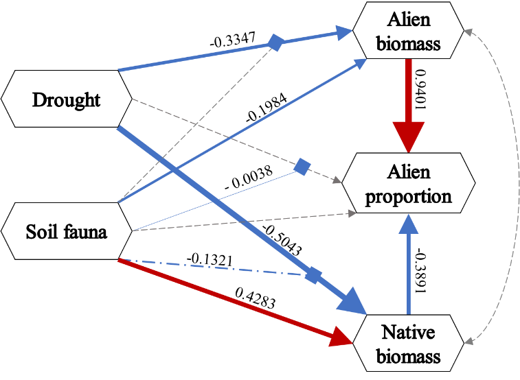 圖3 結(jié)構(gòu)方程模型(SEM)顯示了干旱、土壤動物及其相互作用對外來目標(biāo)植物、本地植物群落生物量以及外來目標(biāo)植物在群落中的生物量比例