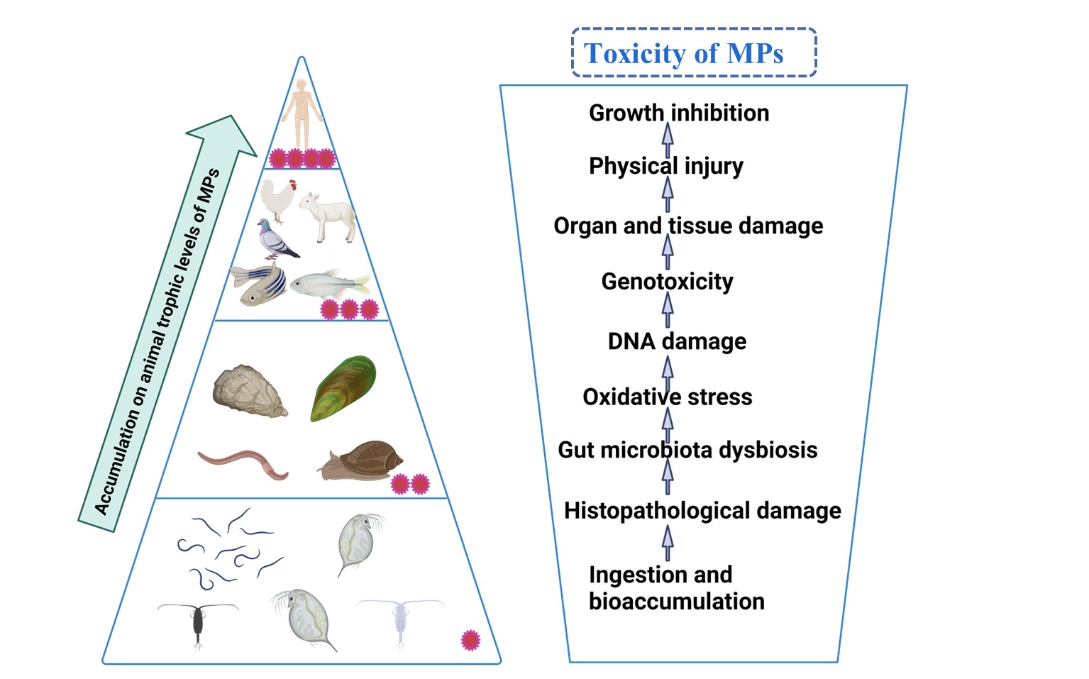 研究發現:塑料廢棄物經過人類生活垃圾等途徑排放進入生態環境中,在生物、物理、化學等條件的作用下分解成更小的塑料微粒,最終分布遷移至整個生態系統(圖1)。微塑料會引起植物氧化應激,進而導致遺傳毒性和細胞毒性等(圖2)。微塑料在不同動物營養級水平之間傳遞并造成包括組織病理學損傷、腸道微生態失調、氧化應激、DNA損傷、遺傳毒性、器官和組織損傷,最終造成生長抑制(圖3)。文章最后對微塑料未來的研究進行了展望,對于微塑料毒性的研究應與其他污染物及添加劑聯合考慮;呼吁未來應加強對于微塑料在大動物,如牲畜、家禽等與人類關系密切的動物的研究等。