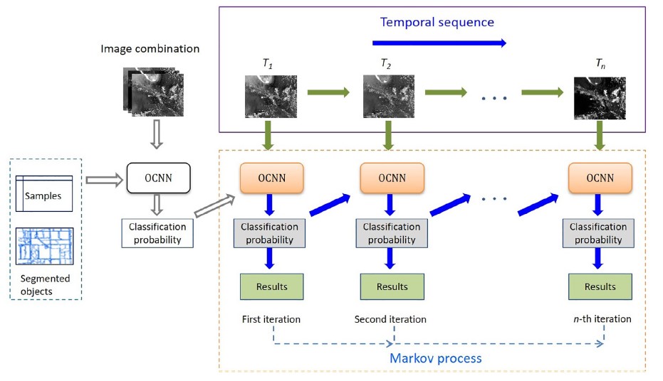 近日,中國科學院東北地理與農業生態研究所地理信息系統學科組研究人員構建了一種新穎的時間序列深度學習遙感分類框架TS-OCNN(圖1),充分挖掘了多時相遙感影像蘊藏的豐富信息,提高了多時相遙感農作物分類精度。研究者將時間序列影像作為一個隨機過程,利用馬爾可夫過程模型將時間序列影像貫序連接,在多時相聯合信息挖掘利用基礎上,利用信息傳導的方式將不同時相影像的分類信息逐步傳遞匯合,從而實現了多時相影像聯合信息和單景信息的共同發掘和利用。