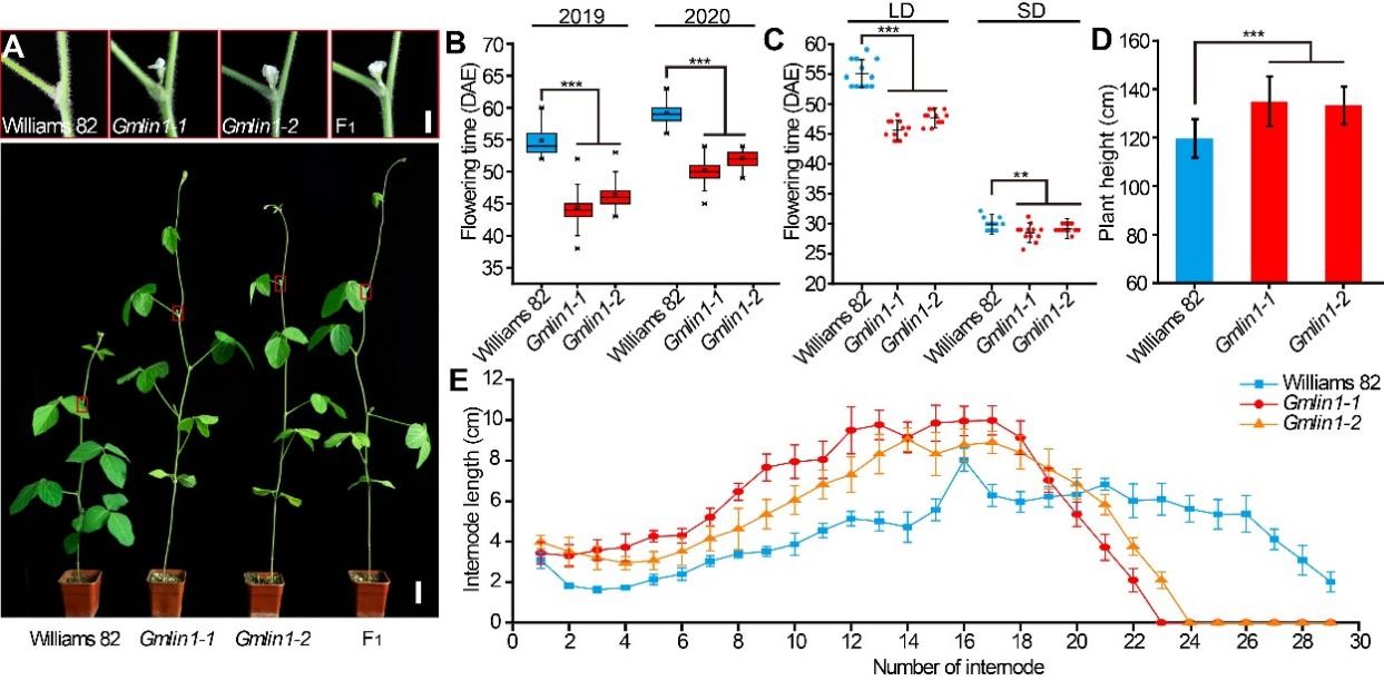 圖1. 大豆野生型Williams 82和突變體Gmlin1的表型差異