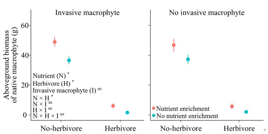 (1)富營養化顯著增加了本地植物群落的地上生物量,但不影響入侵植物粉綠狐尾藻的地上生物量(圖2)。因此,養分富集降低了群落中入侵植物粉綠狐尾藻的生物量占比(圖3b)。