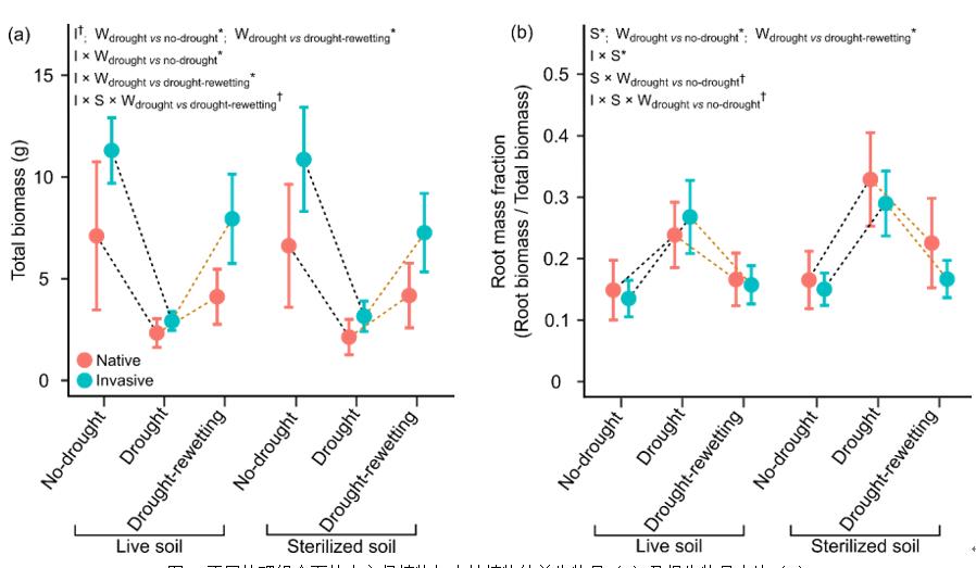 結果表明:無論土壤微生物是否存在,干旱對外來入侵植物生長的抑制效應顯著強于對本地植物的抑制效應(圖2),這與前人的研究結果類似。然而,干旱之后的再潤濕處理對外來入侵植物生長的促進效應卻強于對本地植物的促進效應,即外來入侵植物響應干旱-再濕潤事件的恢復能力更強(圖2)。這是符合理論預期的。此外,當有土壤微生物存在時,外來入侵植物響應干旱-再濕潤的這種恢復能力得到了再次提升(圖2)。