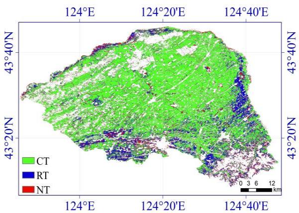 保護性耕作可以減少水土流失、保持乃至增高土壤有機質含量,并使黑土退化的現象得到有效的遏制。環保技術信息中心(CTIC)將秸稈覆蓋度大于30%的耕作稱為免耕(NT),15%–30%的稱為少耕(RT),秸稈覆蓋度為0-15%被稱為傳統耕作(CT)。秸稈覆蓋度是保護性耕作識別的重要判別依據。遙感技術可以大范圍、快速、動態、客觀地獲得秸稈覆蓋信息,有效彌補地面監測空間不連續和以點帶面的不足。然而,現階段可用的光學影像雖較為豐富,但是在特定區域特定時間內進行秸稈覆蓋遙感動態變化監測研究時由于云雨影響,高時空分辨率的數據少之又少。中國科學院東北地理所研究人員基于MODIS和Sentinel-2遙感數據通過改進型時空自適應反射率模型(Enhanced Spatial and Temporal Adaptive Reference Fusion Model, ESTARFM)模型預測出所需日期的耕作指數。在此基礎上,利用玉米秸稈覆蓋度(MRC)和耕作指數之間的經驗模型估算出研究區內的MRC,以MRC為判別標準,識別研究區內的保護性耕作區域。該方法為保護性耕作遙感監測研究提供了更多可用的秸稈覆蓋時空信息,為農業部門開展黑土地保護工作提供基礎數據和方法支撐。