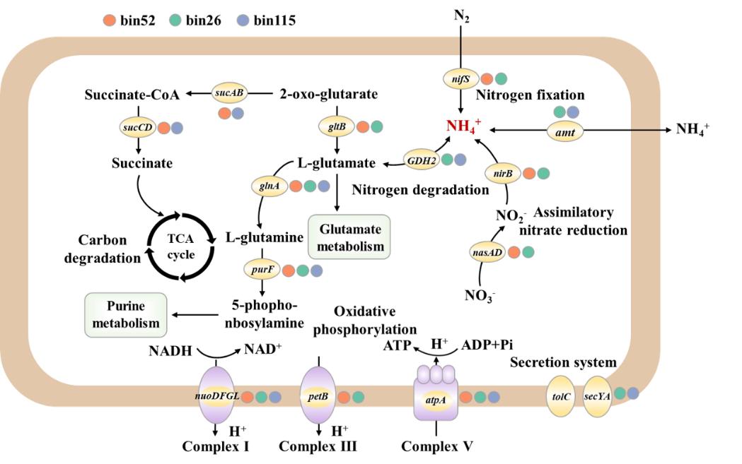 BMP與PE-MP微塑料圈中氮代謝關(guān)鍵微生物組成也存在明顯差異,變形菌在BMP上顯著富集而PE-MP微塑料圈增加了放線菌豐度,其中Ramlibacter主導(dǎo)了BMP與PE-MP微塑料圈中多條氮代謝差異途徑,BMP殘留增加土壤中Ramlibacter豐度的同時刺激該菌在微塑料圈中的進(jìn)一步富集。利用宏基因組binning技術(shù)拼接獲得29個高質(zhì)量基因組,均分類為變形菌和放線菌,其中bin115.bin53和bin26都分類為Ramlibacter,這3個新型物種基因組(ANI<95%)含有調(diào)控氮降解、氮固定和同化硝酸鹽還原代謝路徑的多個拷貝基因,這些代謝路徑共同指向于銨態(tài)氮的生成。進(jìn)一步發(fā)現(xiàn)BMP微塑料圈中的微生物物種調(diào)控氮代謝合成自身所需氮素的同時,通過攜帶的氨轉(zhuǎn)移基因,可將微塑料圈中的有效氮素轉(zhuǎn)運到土壤中,通過測定土壤中銨態(tài)氮的含量發(fā)現(xiàn),BMP殘留土壤中的銨態(tài)氮含量的確高于CK和PE-MP土壤,進(jìn)而驗證了微生物基因組氮代謝機制(圖2)。該研究揭示出生物可降解地膜源微塑料較傳統(tǒng)地膜促進(jìn)土壤有效氮素累積,為推進(jìn)傳統(tǒng)地膜的減量與替代提供微生物學(xué)理論依據(jù)。
