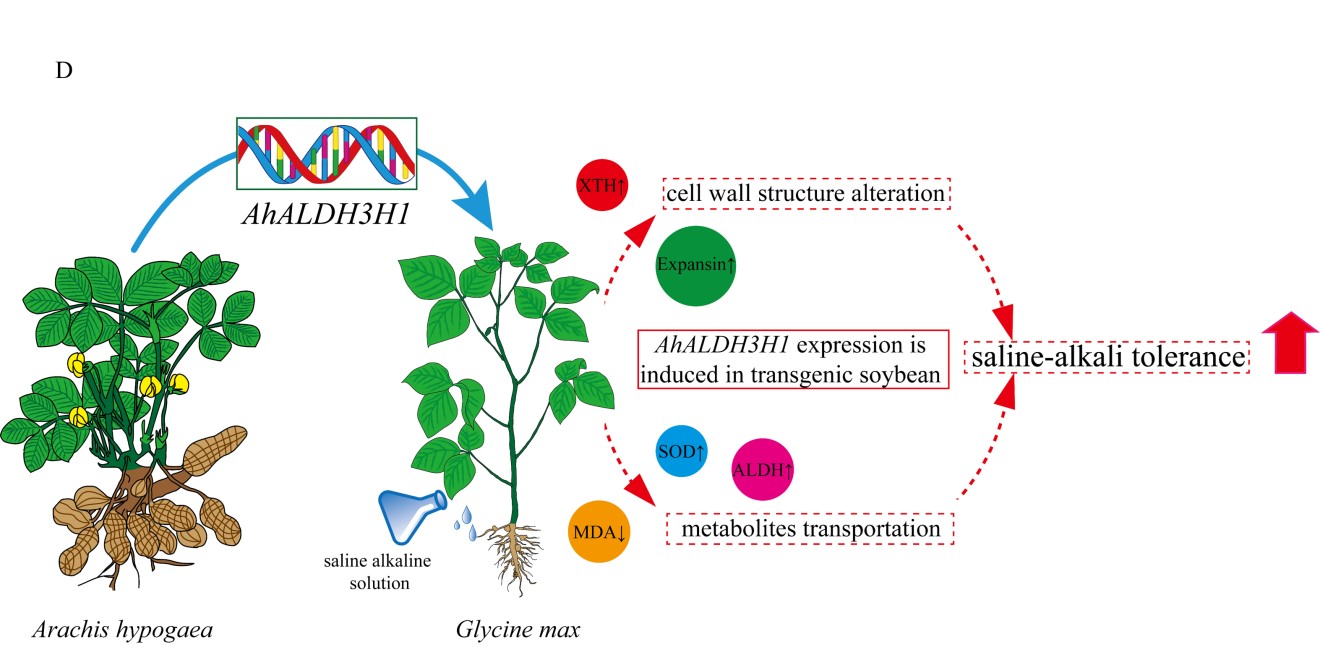 東北地理所農(nóng)田有害生物控制學(xué)科組孟凡立研究團(tuán)隊(duì)成員將來(lái)自于花生ALDH家族的AhALDH3H1基因成功轉(zhuǎn)入大豆受體中,發(fā)現(xiàn)在大豆基因組中過(guò)表達(dá)AhALDH3H1可以顯著增加轉(zhuǎn)基因大豆耐鹽堿能力(圖A-C)。轉(zhuǎn)錄組和代謝組分析表明,過(guò)表達(dá)AhALDH3H1一方面通過(guò)調(diào)控包括木葡聚糖內(nèi)轉(zhuǎn)糖苷酶水解酶(XTH)和擴(kuò)張蛋白(Expansin)在內(nèi)的細(xì)胞壁組成成分相關(guān)的重要基因,減少了鹽堿脅迫對(duì)轉(zhuǎn)基因大豆植株損害。另一方面,在抵御脅迫的過(guò)程中產(chǎn)生的SOD、MDA和ALDH,通過(guò)ABC transporter轉(zhuǎn)運(yùn)途徑被成功轉(zhuǎn)運(yùn),維持細(xì)胞穩(wěn)態(tài)。本研究在大豆中過(guò)表達(dá)了花生的AhALDH3H1基因,獲得了耐蘇打鹽堿的轉(zhuǎn)基因大豆材料,明確了該基因過(guò)表達(dá)提高大豆耐鹽堿的機(jī)理,為大豆耐蘇打鹽堿育種提供理論依據(jù)及新的思路(圖D)。