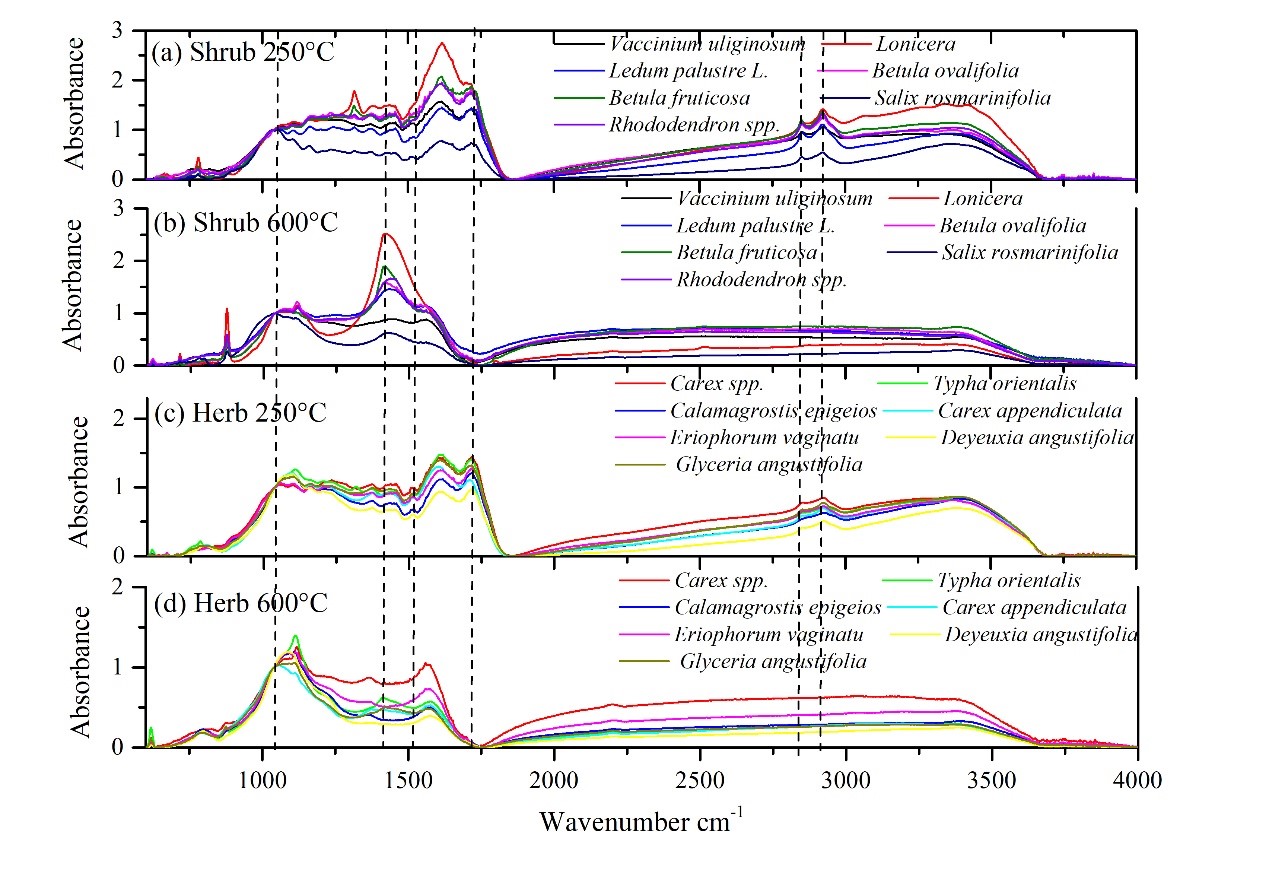 為深入了解火燒對(duì)泥炭沼澤碳庫的影響,東北地理所科研人員以大興安嶺泥炭沼澤為研究對(duì)象。評(píng)估燃燒溫度和燃料類型對(duì)其優(yōu)勢(shì)植被火后熱解碳的化學(xué)組成的影響,并嘗試?yán)脽峤馓嫉幕瘜W(xué)特性對(duì)歷史時(shí)期野火燃料類型和野火強(qiáng)度等信息進(jìn)行準(zhǔn)確重建,評(píng)估其對(duì)泥炭沼澤中穩(wěn)定性較高的含碳化合物(如芳香族化合物和Fe-OC聚合物)累積過程的影響。研究發(fā)現(xiàn)隨著燃燒溫度的增加,較高的燃燒溫度促使熱解碳中不穩(wěn)定的化合物(例如脂肪族化合物和羧酸類化合物)損失,而高溫產(chǎn)生的熱解碳的熱穩(wěn)定性更高。利用FTIR 1515/1050和FTIR1720/1050峰高比率可以簡單對(duì)熱解碳來源和燃燒溫度進(jìn)行識(shí)別,既高的FTIR 1515/1050表示熱解碳來自于灌木燃燒,低的FTIR 1515/1050表示熱解碳來自草本燃燒;而高的FTIR 1720/1050表示熱解碳來自于低溫燃燒,低的FTIR 1720/1050表示熱解碳來自于高溫燃燒。其中對(duì)熱解碳產(chǎn)生溫度識(shí)別的準(zhǔn)確性要明顯高于對(duì)熱解碳燃料來源的準(zhǔn)確性。