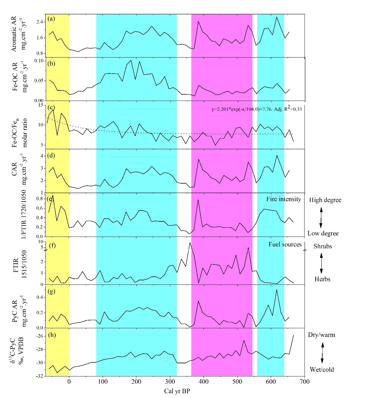 圖2過去700年來大興安嶺北部野火強(qiáng)度和燃料來源變化及其對(duì)泥炭沼澤碳庫中穩(wěn)定性碳組分(芳香族化合物)和活性碳固持量(Fe-OC聚合物)的影響。