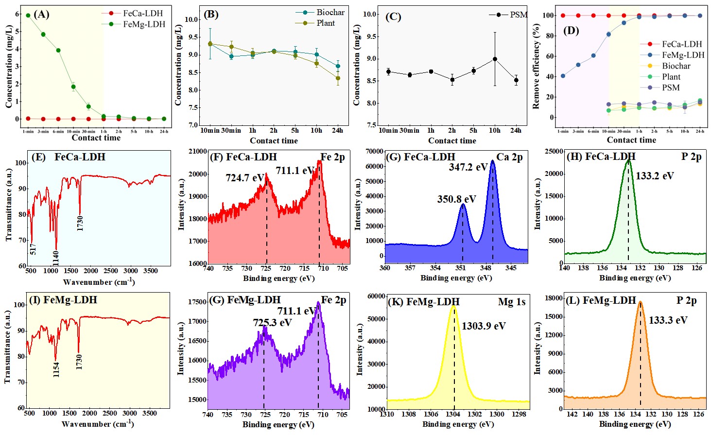 根據水滑石的層狀結構特點和層間離子可交換屬性,東北地理所水環境污染防治團隊通過控制金屬陽離子的比例、pH和溫度等反應條件,采用共沉淀法成功合成了純凈的鐵基層狀雙氫氧化物(FeCa-LDH、FeMg-LDH)(圖1),其通式為[M1-x2+Mx3+ (OH)2]x+ (An-)x/n·mH2O,M2+和M3+是二價和三價金屬陽離子,其與OH-共同構成了陽性主體層;A是層間陰離子,常見的有Cl-、SO42-、CO32-、HCO3-和NO3-。FeCa-LDH和FeMg-LDH呈六邊形、八面體結構(圖2),孔徑介于6~18 nm之間,純度達99%以上。模擬實驗結果表明,污水中磷濃度為10 mg/L,LDH添加量為2.5 g/L條件下,相比生物炭、微生物和植物的對照處理,FeCa-LDH和FeMg-LDH對污水中磷的去除率提高了525% - 661%,處理時間縮短至1 min - 1 h (圖3)。主要去除機制為靜電吸附、配位反應和插層交換(圖 4)。研究還發現,堿性條件下FeCa-LDH的除磷率可提高50%左右,但共存陰離子碳酸氫根對磷的去除率有輕微的抑制作用。FeCa-LDH材料的重復利用性良好,循環使用第5次時的磷去除率仍可達85%。該材料也具有良好的濃度波動抗沖擊性能,污水中磷濃度為600 mg/L時,磷的去除率為62%,可應用于突發污染事故的應急處理中。