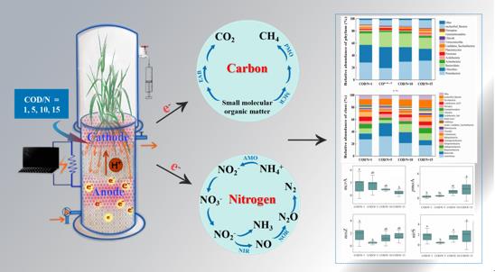 微生物燃料電池耦合人工濕地(MFC-CWs)被廣泛認為在污染物去除方面效果顯著,同時具有較好的產電性能,并被證明相較于傳統人工濕地可減少特定氣體(N2O、CH4和NH3)的排放。但目前關于C/N比對MFC-CWs污水處理效能、溫室氣體及NH3排放、生物產電性能的影響尚不明確,相關微生物學驅動機制也亟需探究。
