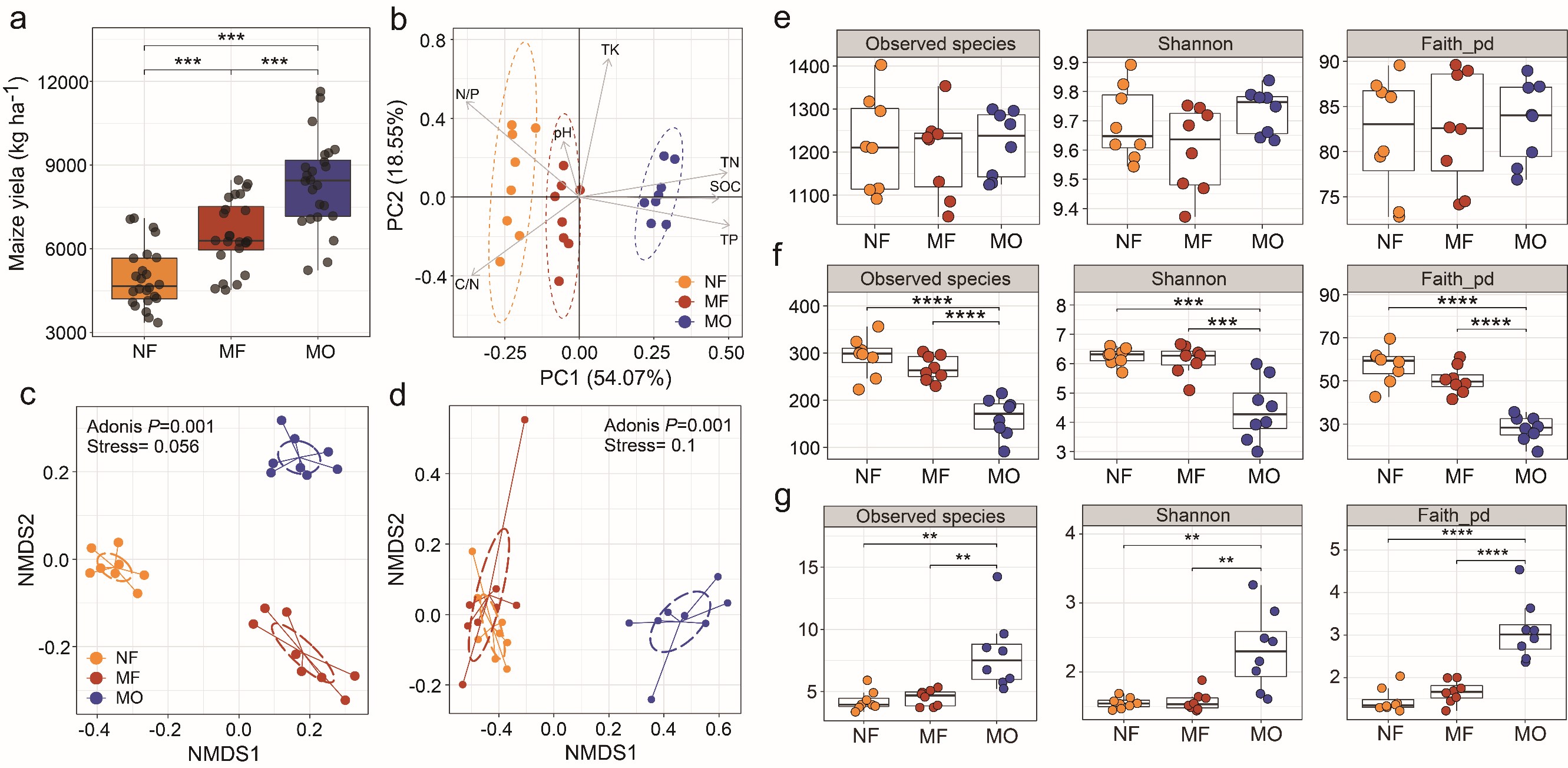 圖1 不同施肥處理對玉米產(chǎn)量(a)、土壤屬性(b)、細(xì)菌群落組成(c)和真菌群落組成(d)的影響
