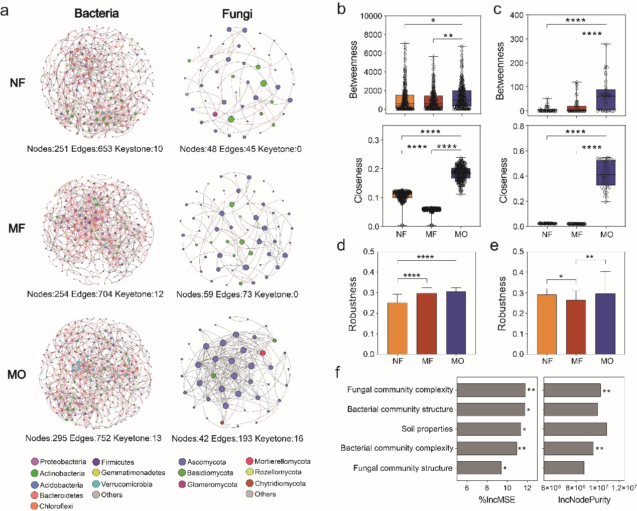 圖2 細(xì)菌和真菌共現(xiàn)網(wǎng)絡(luò)(a)、網(wǎng)絡(luò)特征(b, c)及群落穩(wěn)健性分析(d, e),基于隨機(jī)森林量化土壤屬性和微生物群落特征對玉米產(chǎn)量的相對影響(f)