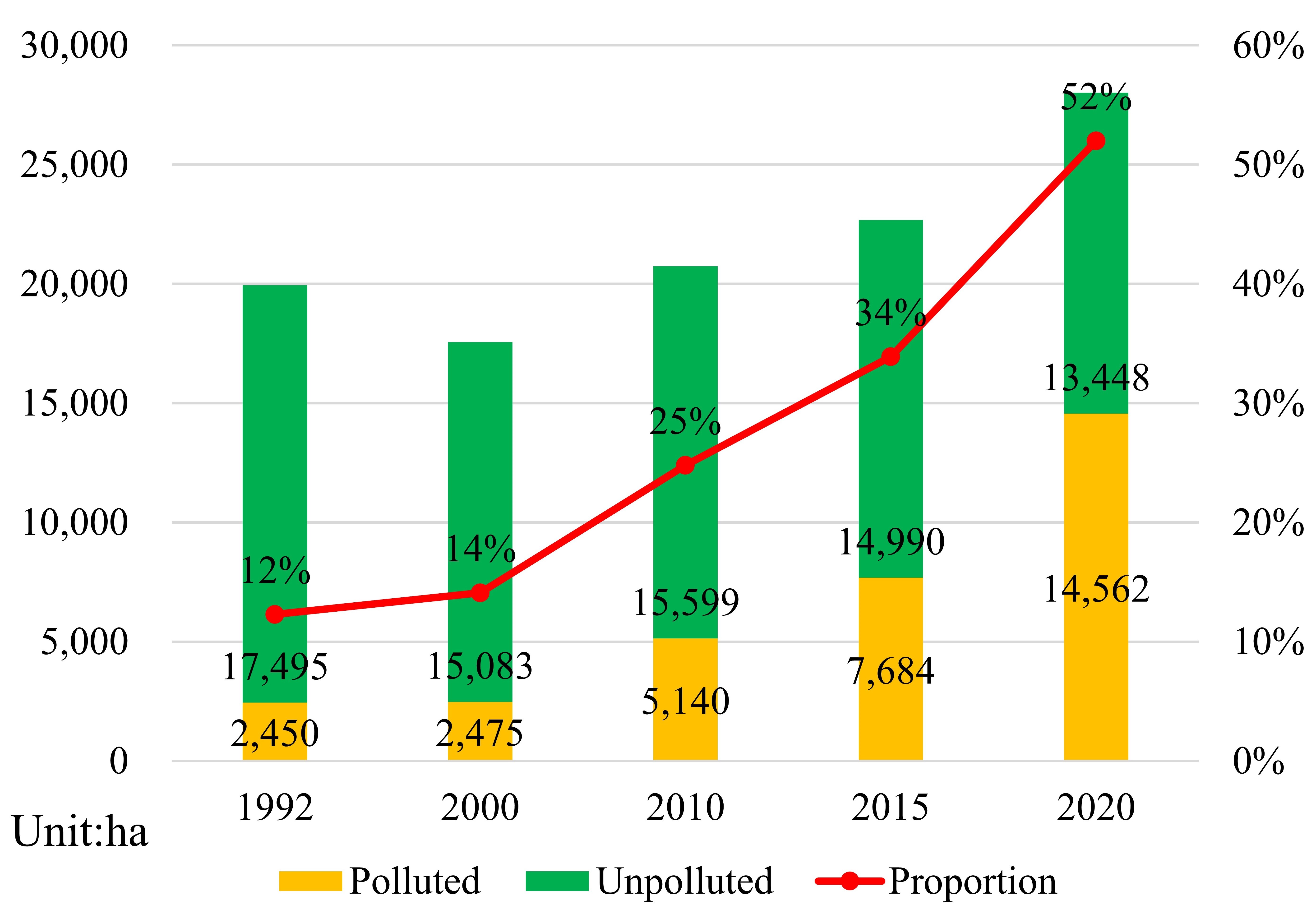 在中國各省區中,污染面積凈增加最多的是廣西,為4086公頃,其次是廣東(3365公頃)和海南(2944公頃)。凈增加比例最多的是浙江,達到99%,其次是海南(66%)和福建(59%)。臺灣則是紅樹林受光污染影響最嚴重的省份,在臺灣,1992年87%的紅樹林受到光污染。自2010年以來,臺灣省的所有紅樹林都受到了光污染的影響。研究中涉及的7個自然保護區中的4個受光污染比例低于全省平均水平,3個受光污染比例高于全省平均水平。從受光污染比例凈增長角度看,6個自然保護區污染比例的凈增長低于其所在省份。因此,建立自然保護區對防止紅樹林光污染是有效的。
