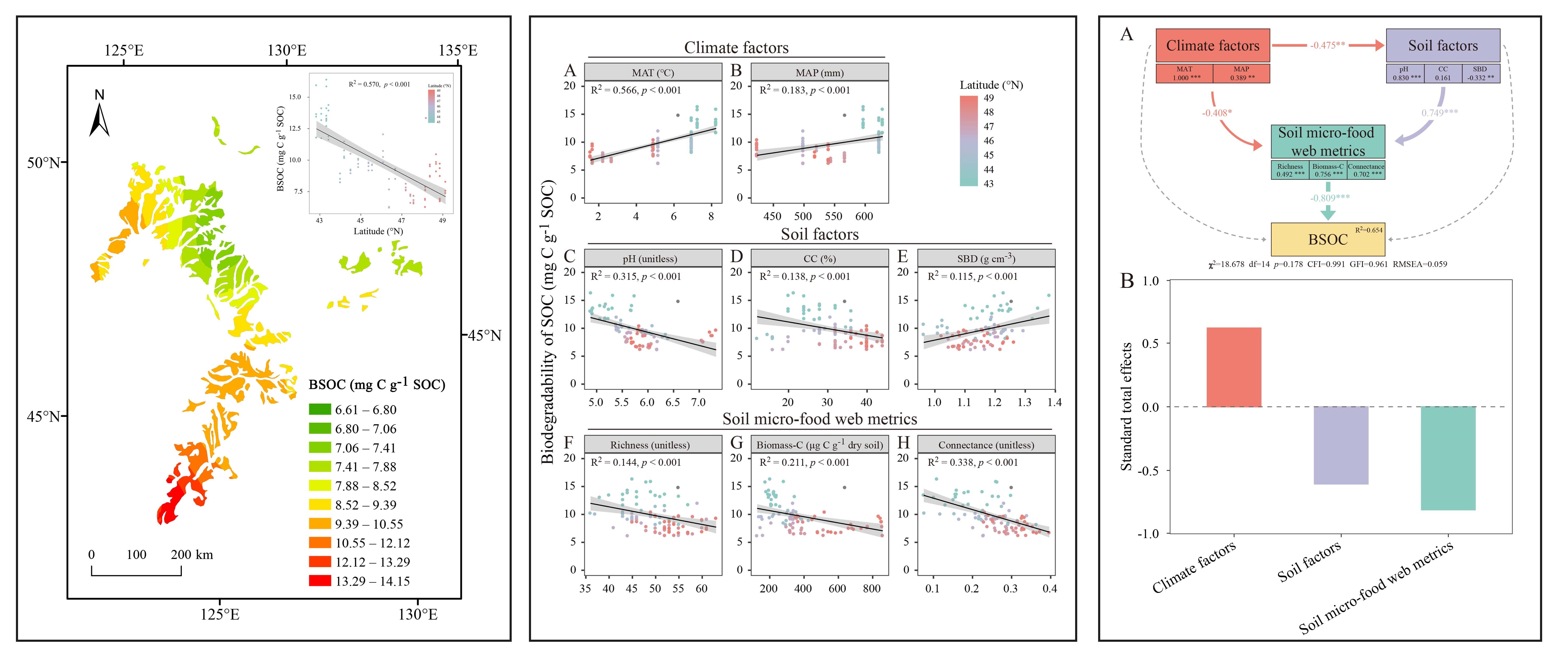 中國科學院東北地理與農業生態研究所黑土有機碳與保護性耕作學科組科研人員以中國東北典型黑土區43°N-49°N緯度范圍內的農田土壤為研究對象,將土壤生物、氣候、土壤因子耦合起來,在區域尺度上深入揭示了農田黑土有機碳生物降解性的緯度分布格局及其驅動機制。研究發現土壤有機碳生物降解性隨緯度增加呈現北低南高的分布格局,該變化趨勢主要受到隨緯度變化的土壤微食物網特性(豐富度、生物量碳和連通性)、氣候因子(年平均溫度和年平均降水)、土壤因子(土壤pH、土壤粘粒含量、土壤容重)的調控作用。通過結構方程模型發現,土壤微食物網特性是影響土壤有機碳生物降解性最直接且最重要的驅動因素。研究結果強調了土壤生物在調控農田生態系統土壤有機碳礦化和固存中的重要作用。
