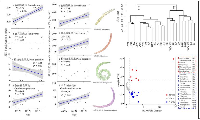 此外,利用形態學鑒定技術首次全面評估了土壤線蟲群落結構在典型黑土區的緯度分布格局。研究發現土壤線蟲總豐富度和總多度的緯度分布格局與土壤有機碳生物降解性類似,均呈現均隨緯度增加而顯著增加的變化趨勢;并且線蟲群落以47°N為分界線可分為南部和北部兩類,土壤pH和土壤容重分別是影響南部與北部黑土區線蟲群落最重要的環境因子。