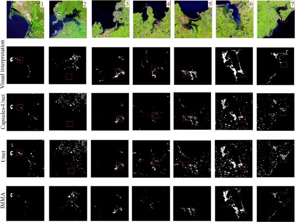 圖 紅樹林遙感識別方法IMMA與深度學(xué)習(xí)分類結(jié)果的比較。其中,目視解譯、Capsules-Unet、Unet結(jié)果均來自于Guo et al. (2021)。