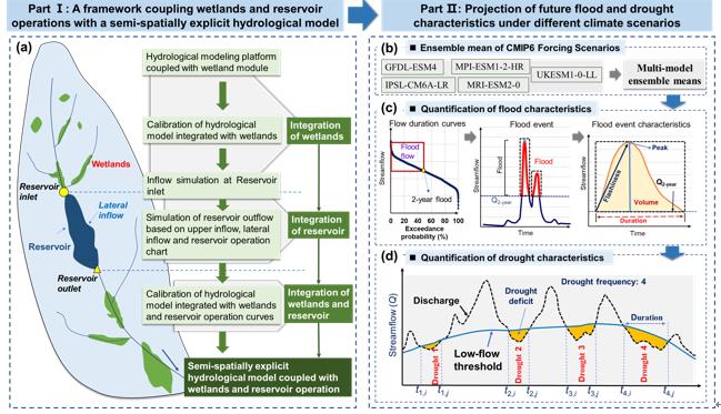 (a)流域濕地-水庫(kù)聯(lián)合調(diào)蓄的分布式耦合框架;(b)基于CMIP6的多情景數(shù)據(jù)的集合平均;(c)基于閾值法洪水事件的確定和特征的提取;(d)基于游程理論的干旱事件的確定及特征的提取。