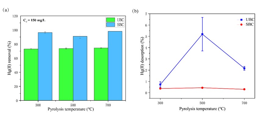 圖1未改性生物炭(UBC)和改性生物炭(SBC)的Hg(II)去除率和解吸率