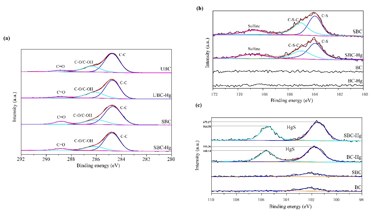 圖3 C1s (a)、S2p (b)和Hg4f (c) 吸附吸附 Hg 前后的XPS光譜