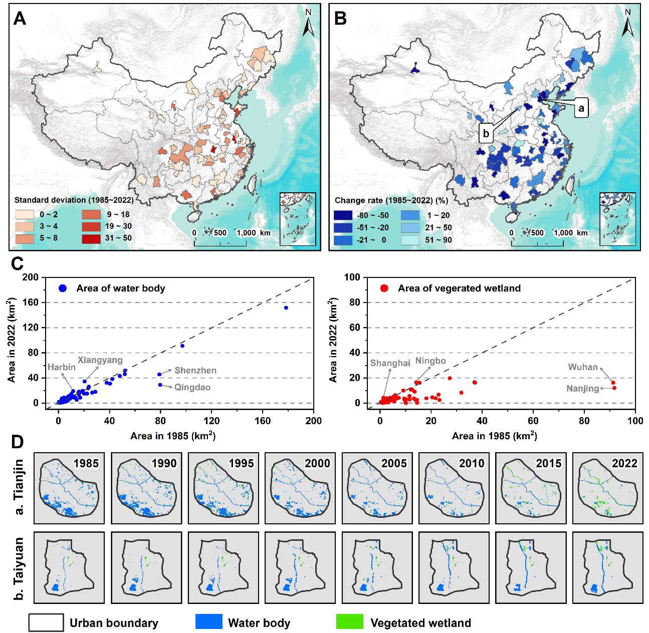 1985-2022年間,中國71個(gè)主要城市中有52個(gè)城市的城市濕地面積呈現(xiàn)出持續(xù)減少的趨勢,其中天津的減少幅度最大,減少了原有面積的 79.40%,其次是烏魯木齊(74.86%)和貴陽(67.55%)。有19個(gè)城市的城市濕地面積略有增加,其中呼和浩特的增幅最大(90.63%),其次是北海(89.21%)和西安(71.34%),雖然這些城市的城市濕地增長幅度較大,但由于其原有城市濕地體量較小,因此凈增長面積相對較小(小于3.88 km2)。從地表水體(Surface water)和有植被覆蓋的濕地(Vegetated wetland)兩種城市濕地類型來看,深圳和青島的地表水體在過去近40年損失最大(55.77km2和 33.54km2),南京和武漢的有植被覆蓋濕地?fù)p失最大(798.76km2和 75.14km2),哈爾濱和襄陽的地表水體面積、以及寧波和上海的有植被覆蓋濕地的面積均略有增加,但增幅較小。