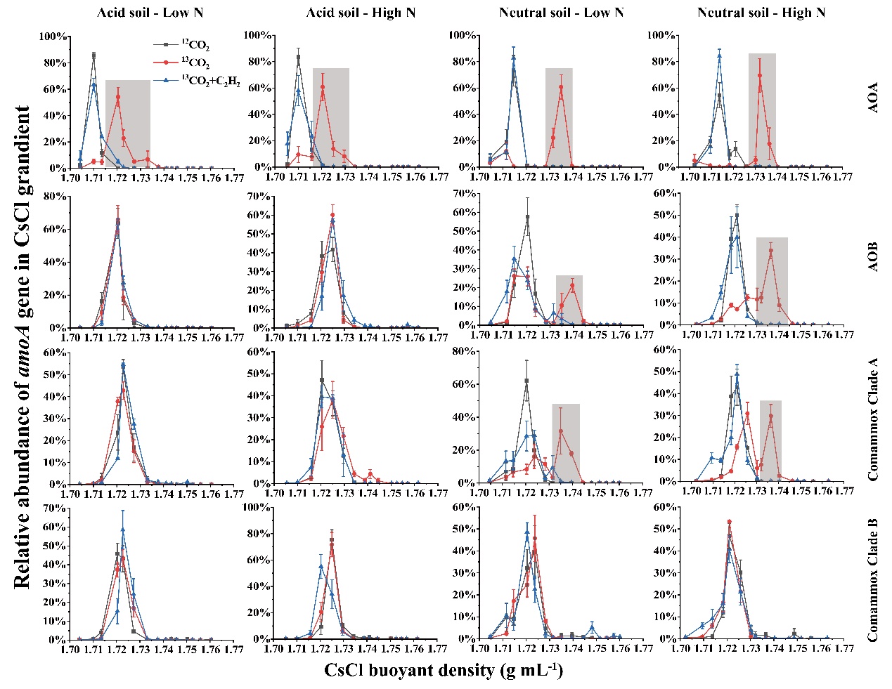 為此,東北地理所農田分子生態學科組研究人員利用13CO2-DNA穩定性同位素標記探針技術(13CO2-DNA-SIP)結合高通量測序技術,揭示出不同pH和NH3濃度處理下典型農田黑土中活性氨氧化微生物的種類和系統發育類群。研究發現,AOA主導酸性土壤的硝化過程,而AOA、AOB和Comammox Clade A共同參與了中性土壤的硝化過程。此外,在中性土壤中,AOB的硝化貢獻隨著底物銨離子濃度的增加而升高。構建的系統發育樹顯示,在酸性低氮、酸性高氮和中性土壤中參與氨氧化的AOA分別隸屬于Nitrososphaera subcluster 1.1、Nitrososphaera subcluster sister 2和Nitrososphaera subcluster sister 1.1。在中性土壤中,參與氨氧化的AOB和Comammox主要隸屬于Nitrosospira cluster 9和Clade A.2。本研究結果為認知東北黑土中三類自養氨氧化微生物的生態位分異提供了科學依據,對黑土氮素生物地球化學循環的管理具有重要意義。