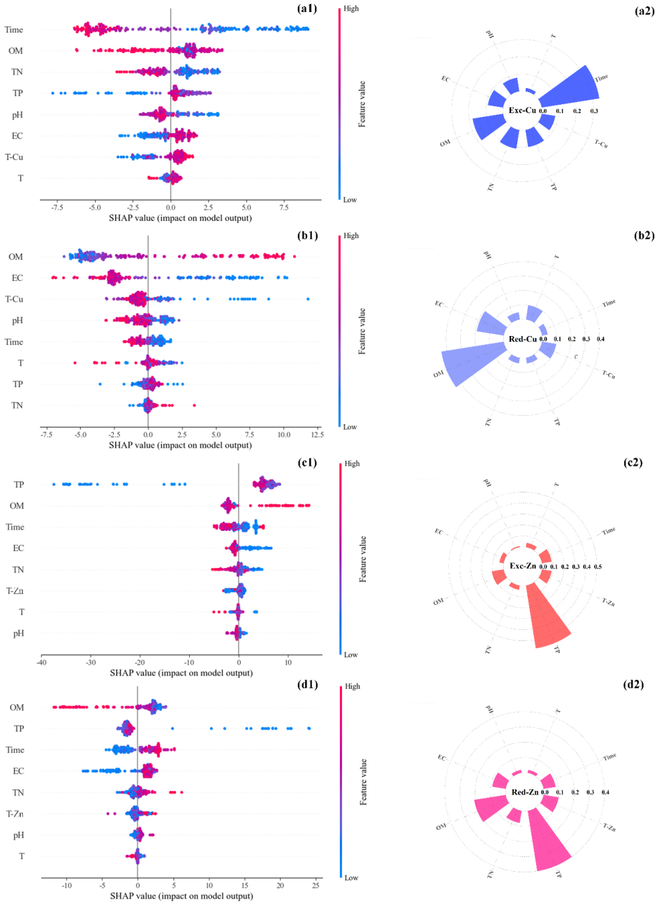 本研究基于課題組15年的數(shù)據(jù)累積及外部數(shù)據(jù)的收集,共取得260組數(shù)據(jù)。以堆肥過程中常見的物質(zhì)變化指標(biāo)(堆肥時間、溫度、pH、EC、OM、TP、TN和重金屬總量)為輸入因子,借助反向傳播神經(jīng)網(wǎng)絡(luò)(BPNN)、梯度增強(qiáng)回歸模型(GBR)、隨機(jī)森林模型(RF),建立了堆肥過程中重金屬形態(tài)快速預(yù)測模型,從而對重金屬有效性進(jìn)行評估。研究結(jié)果表明:BPNN、GBR和RF模型均能預(yù)測堆肥過程中Cu和Zn的形態(tài)分布(圖1),其中RF的預(yù)測性能最好,R2值為0.93-0.97。同時,輸入因子的特征性分析表明(圖2),除堆肥時間外,OM和TP分別是預(yù)測Cu和Zn有效形態(tài)的最重要特征,降低OM或增加TP有助于提升堆肥中Cu和Zn的鈍化能力。本研究識別了Cu和Zn生物有效形態(tài)之間轉(zhuǎn)化的主要影響因子,為評估堆肥生產(chǎn)中重金屬生物有效性評估及調(diào)控提供了一種快速的決策工具;同時拓展了人工智能方法在有機(jī)固廢資源化領(lǐng)域的適用性,對于構(gòu)建生態(tài)安全的種養(yǎng)結(jié)合、農(nóng)牧循環(huán)新格局具有重要推動意義。